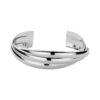 Tijdloze zilverkleurige armband met overlappende lijnen die elegant rond de pols vloeien. De glanzende afwerking vangt het licht en zorgt voor een verfijnde, moderne uitstraling.