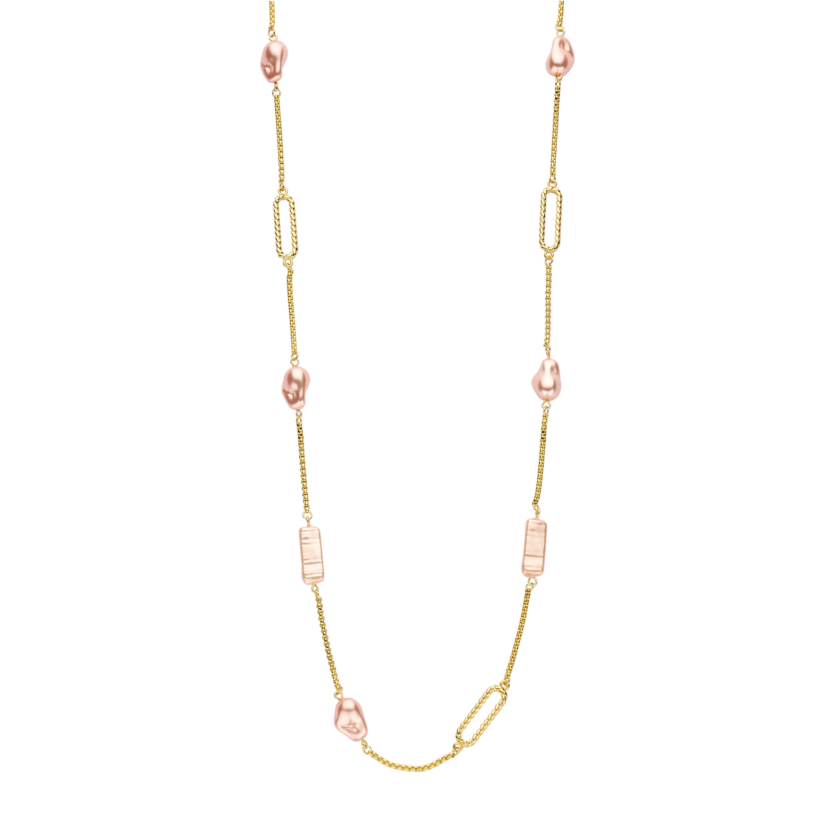 De DADELIEF lange halsketting in vieux rose combineert zachte, warme rosétinten met luxueuze goudkleurige schakels. Het resultaat is een elegant en tijdloos juweel dat moeiteloos elke look verheft. Voor een complete set combineer je deze ketting met de bijpassende armband en oorbellen.
