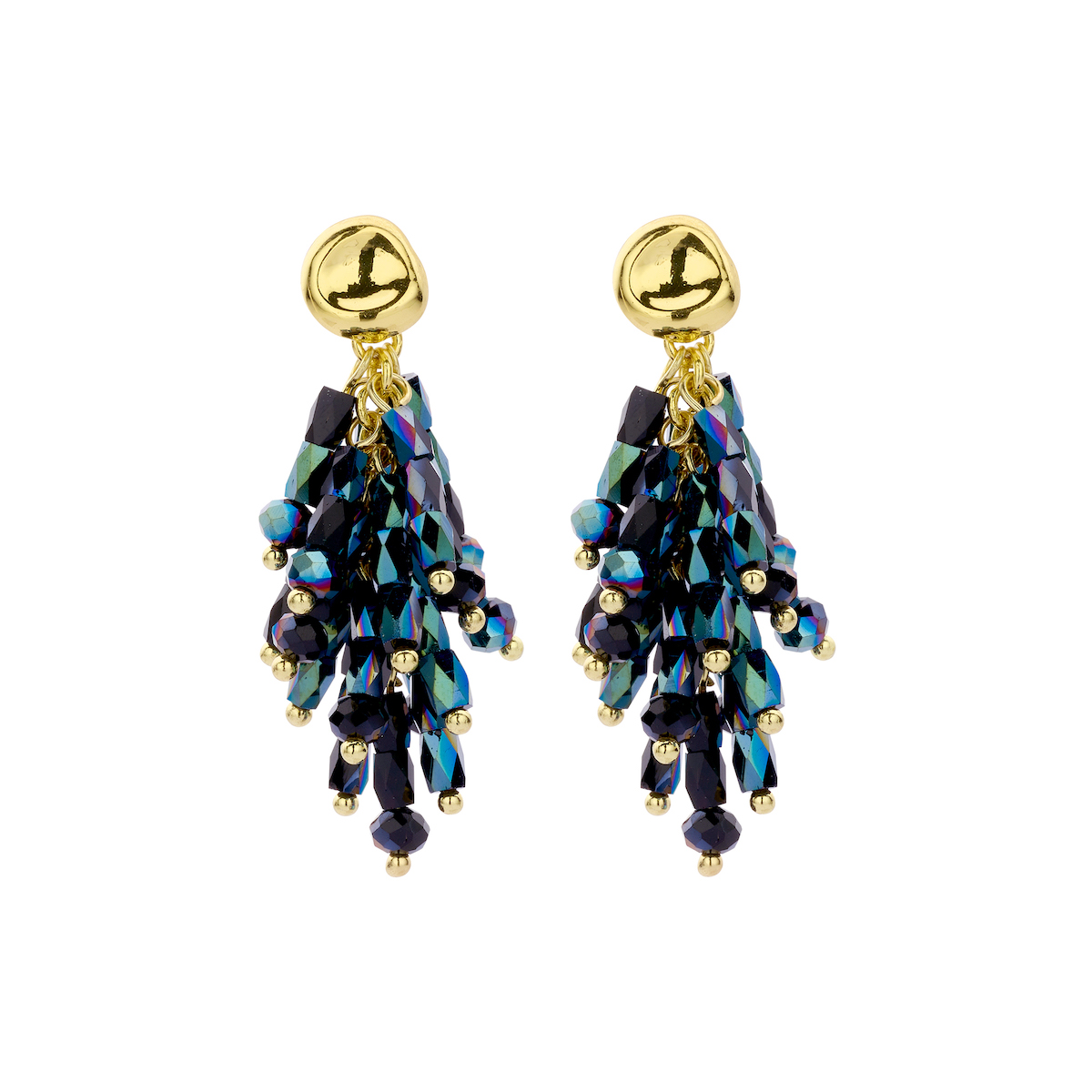 De DALA oorbellen in donkerblauw zijn een opvallende keuze die je look extra karakter geeft. De goudkleurige basis gecombineerd met fonkelende donkerblauwe steentjes in hars zorgen voor een luxueuze uitstraling. Draag deze oorbellen alleen voor een krachtige statement of combineer met de bijpassende halsketting.
