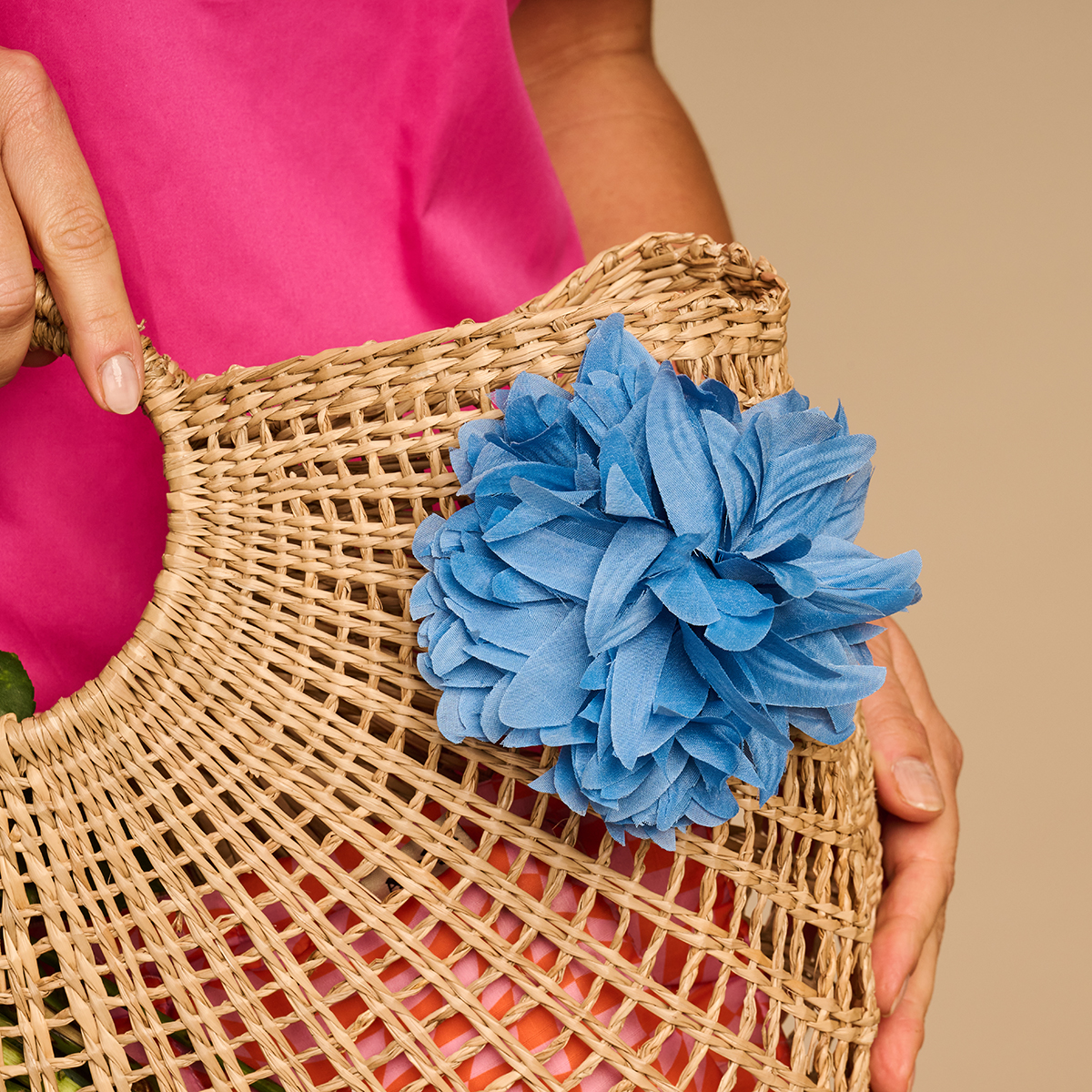 De MBR59 broche in lichtblauw is een verfijnde bloemvormige accessoire die zachtheid en frisheid uitstraalt. Perfect om te combineren met zomerse tinten of pastelkleuren voor een luchtige look.